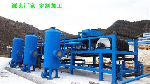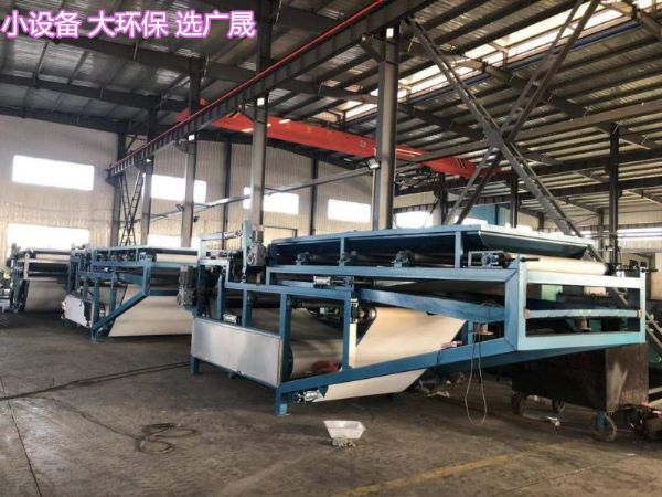 连续水平真空带式过滤机以滤布为过滤介质,采用整体的环形橡胶带作为真空室。环形橡胶带由传动装置传动连续运行,滤布铺敷在胶带上与之同步运行,腔带与真空滑台接触(真空室与橡胶带间装有环形摩擦带并通入水形成水密封),料浆由布料器均匀地分布在滤布上。当真空室接通真空系统时,在橡胶带上形成真空抽滤区,滤液穿过滤布经橡胶带上的横沟槽汇总并由中心孔进八真空室,固体颗料被截留在滤布上形成滤饼,随着橡胶带的移动,已形成的滤饼受压力差影响逐步被脱干,后滤布与胶带分开,在卸料辊处将滤饼卸出,进入真空室的液体经气水分离器排出。