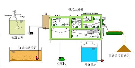 带式浓缩压滤设备脱水过程可分为预处理、重力脱水、楔形区脱水及压榨脱水四个重要阶段。污泥通过污泥泵送至泥药混合器,经加药絮凝反应充分混合后送至带压机,经重力楔形脱水、预压、压榨脱水成为泥饼,由卸泥装置将泥饼卸除。