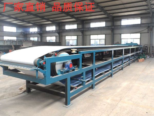 硫铁矿真空带式过滤机以滤布为过滤介质,采用整体的环形橡胶带作为真空室。环形橡胶带由传动装置传动连续运行,滤布铺敷在胶带上与之同步运行,腔带与真空滑台接触(真空室与橡胶带间装有环形摩擦带并通入水形成水密封),料浆由布料器均匀地分布在滤布上。当真空室接通真空系统时,在橡胶带上形成真空抽滤区,滤液穿过滤布经橡胶带上的横沟槽汇总并由中心孔进八真空室,固体颗料被截留在滤布上形成滤饼,随着橡胶带的移动,已形成的滤饼受压力差影响逐步被脱干,后滤布与胶带分开,在卸料辊处将滤饼卸出,进入真空室的液体经气水分离器排出。卸除滤饼后滤布经清洗后获得再生,再经过一组支撑辊和纠偏装置重新进入过滤区,开始进入新一过滤周期。