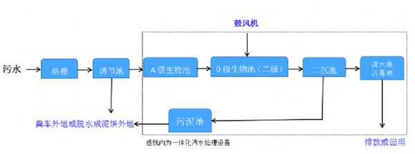 一体化农村污水处理设备调试工作由设备公司负责,为了加快调试工作,可投入菌种,为了避免菌种流失,可减少进水量并启动风机进行曝气,直至填料上长出一层橙黄色生物膜,即完成填料挂膜,然后将进水量增加至额定流量。完成填料挂膜后,再对A级生物池内微生物进行驯化,即逐渐减少曝气量,使A级生物池处于缺氧状态,使填料上微生物变为兼性微生物,然后对微生物进行适应性运转,直至达到设计要求。