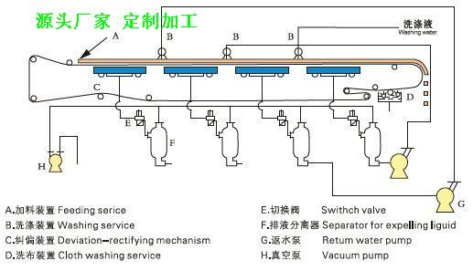 带式真空过滤机是以真空吸力作为动力来完成过滤过程,同时在物料通过沉淀区时,固体物质的大小颗粒有序排列,大颗粒排列在底层,小颗粒排列在上层,这样水平真空带式过滤机能获得更好的滤饼结构,减小滤液的通透阻力,增加过滤速度。