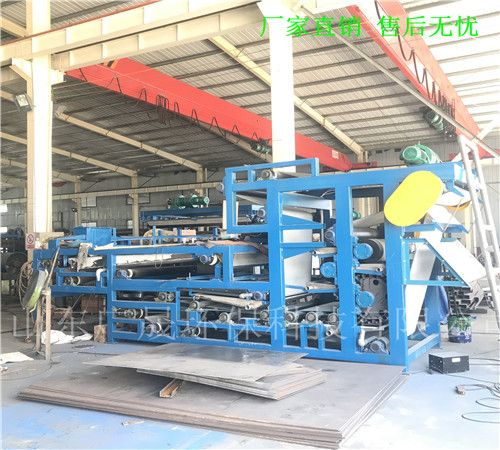 带式压泥机是通过两条滤带缠绕在一系列顺序排列、大小不等的辊轮上,利用滤带间的挤压和剪切作用,来脱除料浆中水分的一种压滤设备,具有着能连续作业、自动化程度高、节能、使用维护方便等优点,是一种进行污泥脱水减量化处理的理想设备。