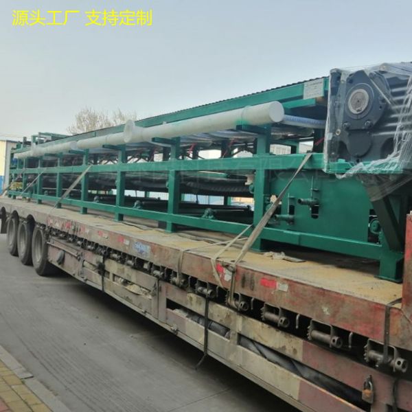 4.对夹挤压辊(或带)高压脱水区,污泥脱离中压区后就进入高压区,污泥在此区内受到1~3组对夹辊(或带)挤压,经过挤压后体积大幅收缩,污泥内的间隙游离水被充分挤出,此时,形成含固率较高的滤饼,分体式浓缩带式污泥脱水机特别适用大型矿山尾泥、大型洗砂场,石场制砂泥浆脱水、陶瓷原料泥浆、洗山砂、土包沙泥浆脱水、河道清淤等工业污泥深度脱水处理和大型污水厂的使用。